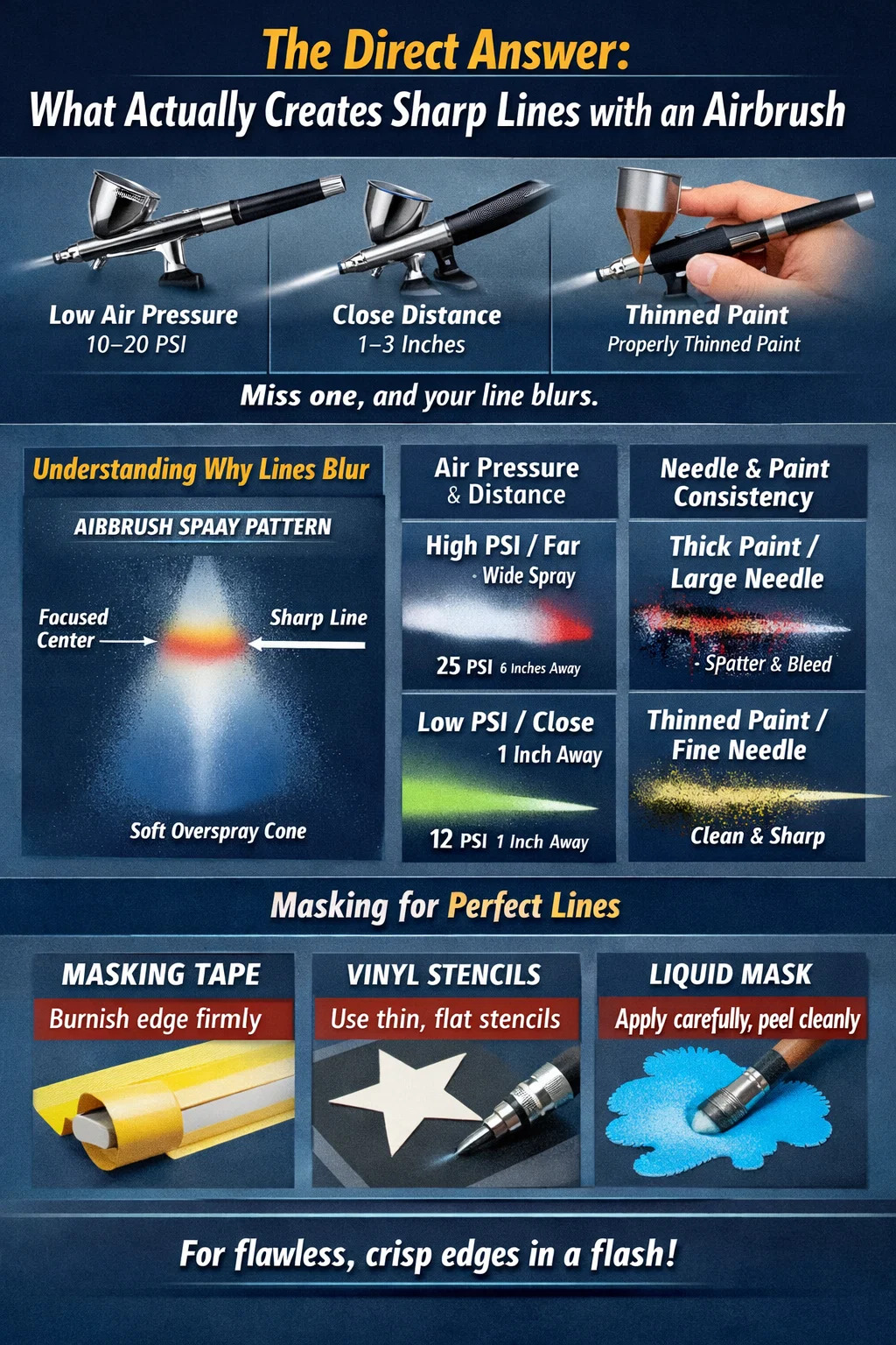 Четкие линии, нанесенные аэрографом, сводятся к четырем основным переменным, работающим вместе: низкое давление воздуха (обычно 10–20 фунтов на квадратный дюйм) , близкое рабочее расстояние (1–3 дюйма от поверхности), правильно разбавленная краска и продуманное управление спусковым крючком. Пропустите хотя бы один из них, и ваша линия смягчится, начнет кровоточить или разбрызгиваться. Большинству новичков приходится нелегко, потому что они работают слишком далеко от поверхности и используют слишком сильное давление — две привычки, которые сразу же убивают точность.